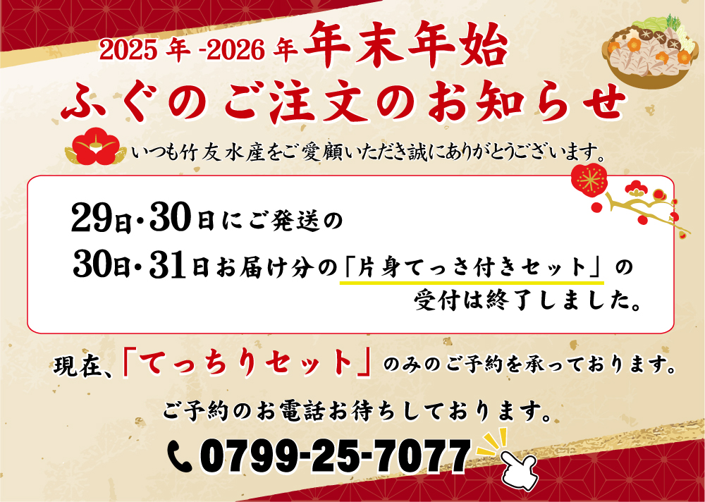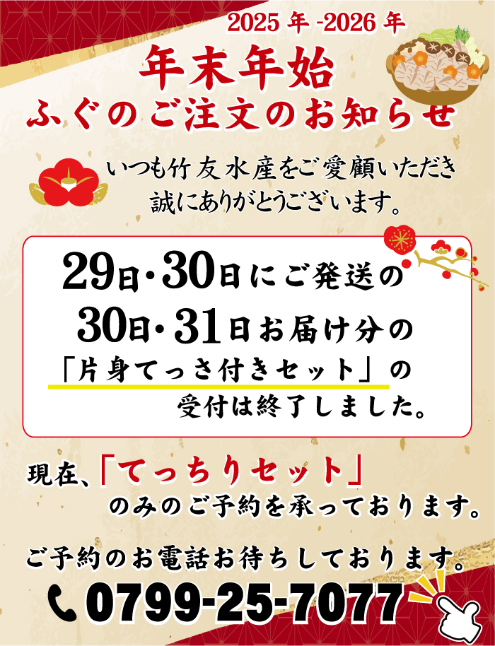 「片身てっさ付きセット」につきまして、予定数量に達しましたため、ご予約受付を終了させていただきました。